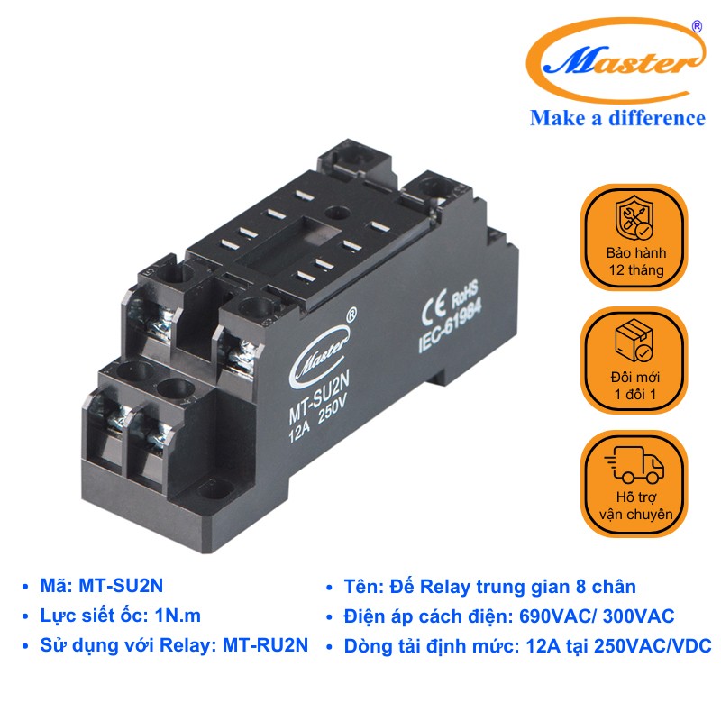 Đế relay trung gian MT-SU2N Master là phụ kiện chuyên dùng để lắp đặt và kết nối relay trung gian 8 chân trong các hệ thống tủ điện điều khiển và tự động hóa công nghiệp. Sản phẩm được thiết kế theo chuẩn socket relay 8 chân, giúp việc đấu nối relay nhanh chóng, an toàn và thuận tiện cho việc thay thế hoặc bảo trì. Đế relay có thiết kế gắn DIN rail 35mm, terminal đấu dây chắc chắn, phù hợp sử dụng với các dòng relay trung gian 8 chân như MT-RU2N Master trong nhiều hệ thống điều khiển công nghiệp.