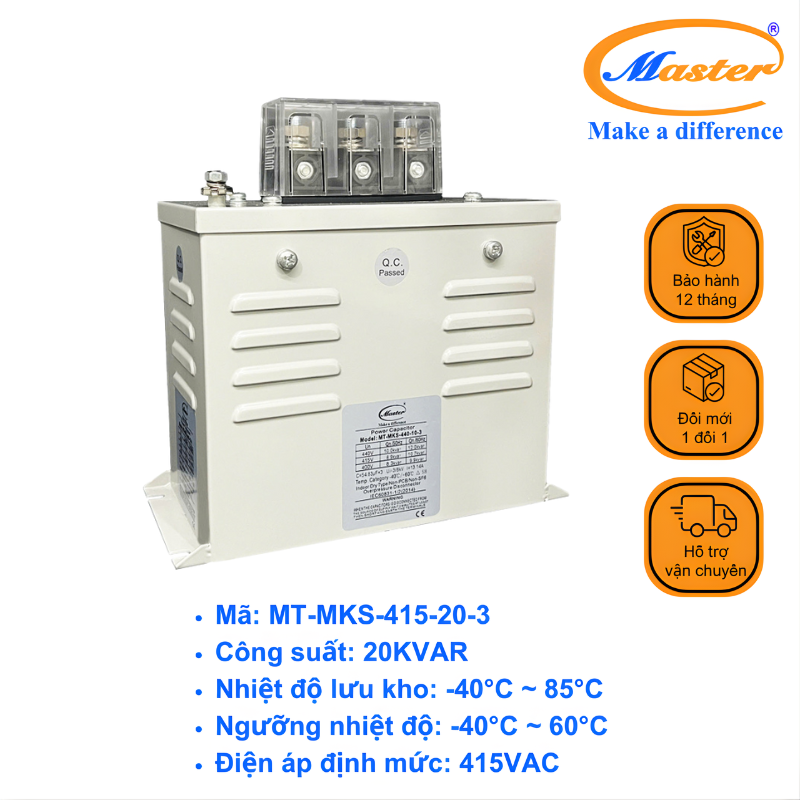 Tụ bù chống cháy nổ Master vuông loại khô 3P 20KVAR 415VAC được làm từ tấm thép cường độ cao được dùng làm vỏ. Bên trong gồm nhiều tụ điện dung lượng nhỏ. Mỗi phần tử nhỏ bên trong được bảo vệ độc lập. Các tụ điện bên trong là tụ tròn được thiết kế chống nổ và vật liệu làm đầy bằng nhựa PU chống cháy loại khô tương tự như các tụ tròn model MT-MKC. Tụ MT-MKS còn được thiết kế với khả năng chịu quá dòng, quá áp vượt trội. Vì thế sản phẩm có độ an toàn rất cao. Có thể sử dụng được trong môi trường khắc nghiệt.