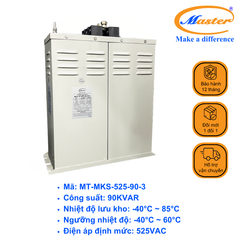 Tụ bù chống cháy nổ Master vuông loại khô 3P 90KVAR 525VAC được làm từ tấm thép cường độ cao được dùng làm vỏ. Bên trong gồm nhiều tụ điện dung lượng nhỏ. Mỗi phần tử nhỏ bên trong được bảo vệ độc lập. Các tụ điện bên trong là tụ tròn được thiết kế chống nổ và vật liệu làm đầy bằng nhựa PU chống cháy loại khô tương tự như các tụ tròn model MT-MKC. Tụ MT-MKS còn được thiết kế với khả năng chịu quá dòng, quá áp vượt trội. Vì thế sản phẩm có độ an toàn rất cao. Có thể sử dụng được trong môi trường khắc nghiệt.