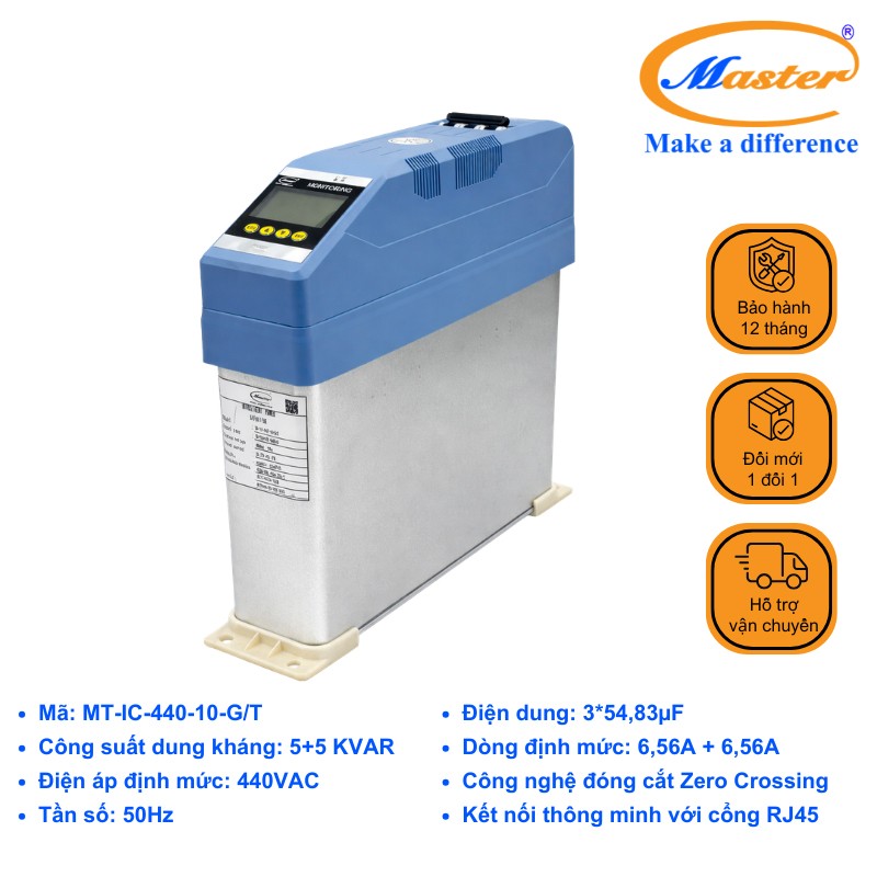 Tụ bù thông minh 3P 10KVAR 440VAC Master là dòng sản phẩm thế hệ mới, tích hợp toàn bộ chức năng đo lường, điều khiển, bảo vệ và đóng cắt trong một thiết bị duy nhất. Sản phẩm được thiết kế nhằm thay thế hoàn toàn các hệ thống tụ bù truyền thống sử dụng contactor, MCCB và bộ điều khiển rời. Với công nghệ đóng cắt zero-crossing hiện đại, thiết bị giúp tối ưu hiệu suất bù, giảm tổn hao điện năng, nâng cao tuổi thọ tụ và đảm bảo vận hành ổn định, an toàn trong mọi điều kiện làm việc.