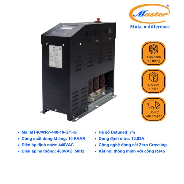 Tụ bù thông minh Master 3P 10KVAR 440VAC tích hợp cuộn kháng 7% là giải pháp chuyên dụng giúp vừa bù công suất phản kháng vừa xử lý sóng hài hiệu quả. Sản phẩm tích hợp cuộn kháng detuned ngay bên trong, giúp hệ thống vận hành ổn định, an toàn và bền bỉ trong môi trường có THDi cao. Đây là dòng tụ bù thông minh thế hệ mới của Master, được tích hợp sẵn cuộn kháng lọc sóng hài với hệ số detuned 7%, giúp ngăn chặn cộng hưởng và hạn chế khuếch đại sóng hài trong hệ thống điện.