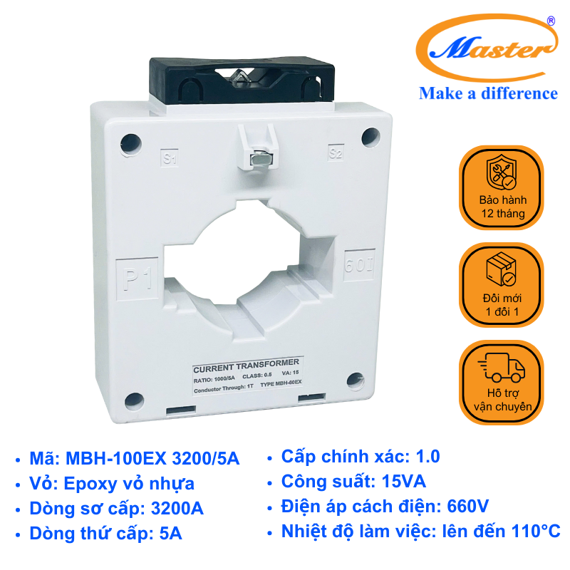Biến dòng đo lường MBH-100EX 3200/5A - Loại Epoxy vỏ nhựa là thiết bị dùng để chuyển đổi dòng điện sơ cấp lớn thành dòng thứ cấp 5A an toàn, phục vụ cho đo lường và bảo vệ trong tủ điện. Sản phẩm có thiết kế nhỏ gọn, giao diện hiện đại giúp dễ dàng lắp đặt trong các tủ điện công nghiệp, đảm bảo độ ổn định và độ chính xác cao và bố cục thuận tiện cho việc luồn thanh cái. Giao diện bên ngoài hiện đại, dễ nhận biết và phù hợp với mọi hệ thống tủ điện công nghiệp.